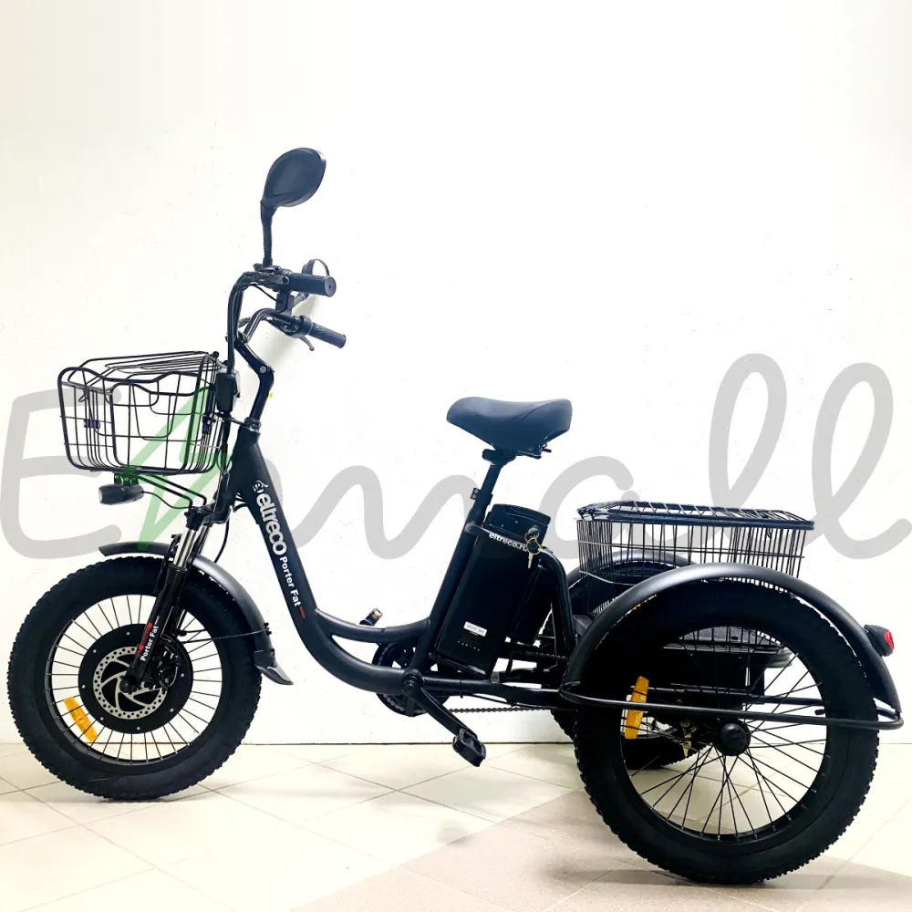 ТРИЦИКЛ ELTRECO PORTER FAT 500 UP!  – это современный трехколесный грузовой электротранспорт. Оснащен мощным электродвигателем в 500W, устойчивый и надежный в езде. С ним можно работать на даче, в саду, использовать в поездках по магазинам или для перевозки небольших грузов. Он подходит даже для обычных велопрогулок.