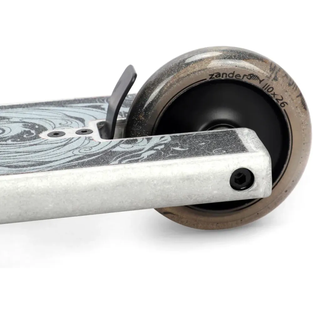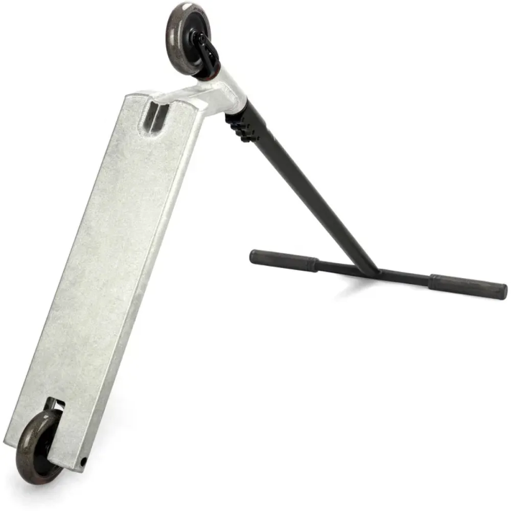 Немаловажную роль играет надежность самоката. Руль выполнен из прочного, стального материала Cr-mo. Самокат оборудован надёжной и тяжёлой компрессией SCS. Тормоза типа Фендер позволяют продлить срок службы колёс как можно дольше. Вес самоката 4 кг, руль шириной 580 мм, место для постановки ног (футспейс) 390 мм, высота руля 720 мм.